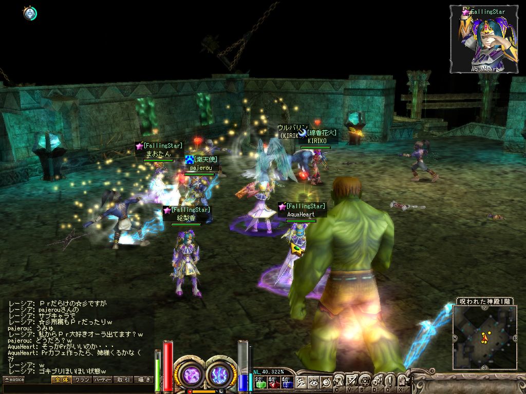 パーティを結成して狩りに繰り出す。メンバーはKIRIKOさん、pajerouさん、AquaHeartさん(☆彡)、まおたんさん(☆彡)、絵梨香さん(☆彡)。☆彡メンバーはPr4人という超偏重パーティ。ちなみにAquaHeartさんと、まおたんさんがメイン火力、絵梨香さんは火力とGH、レーシアはGHとVLに寄せていますので、攻守のバランスはそこそこよかったりしてw